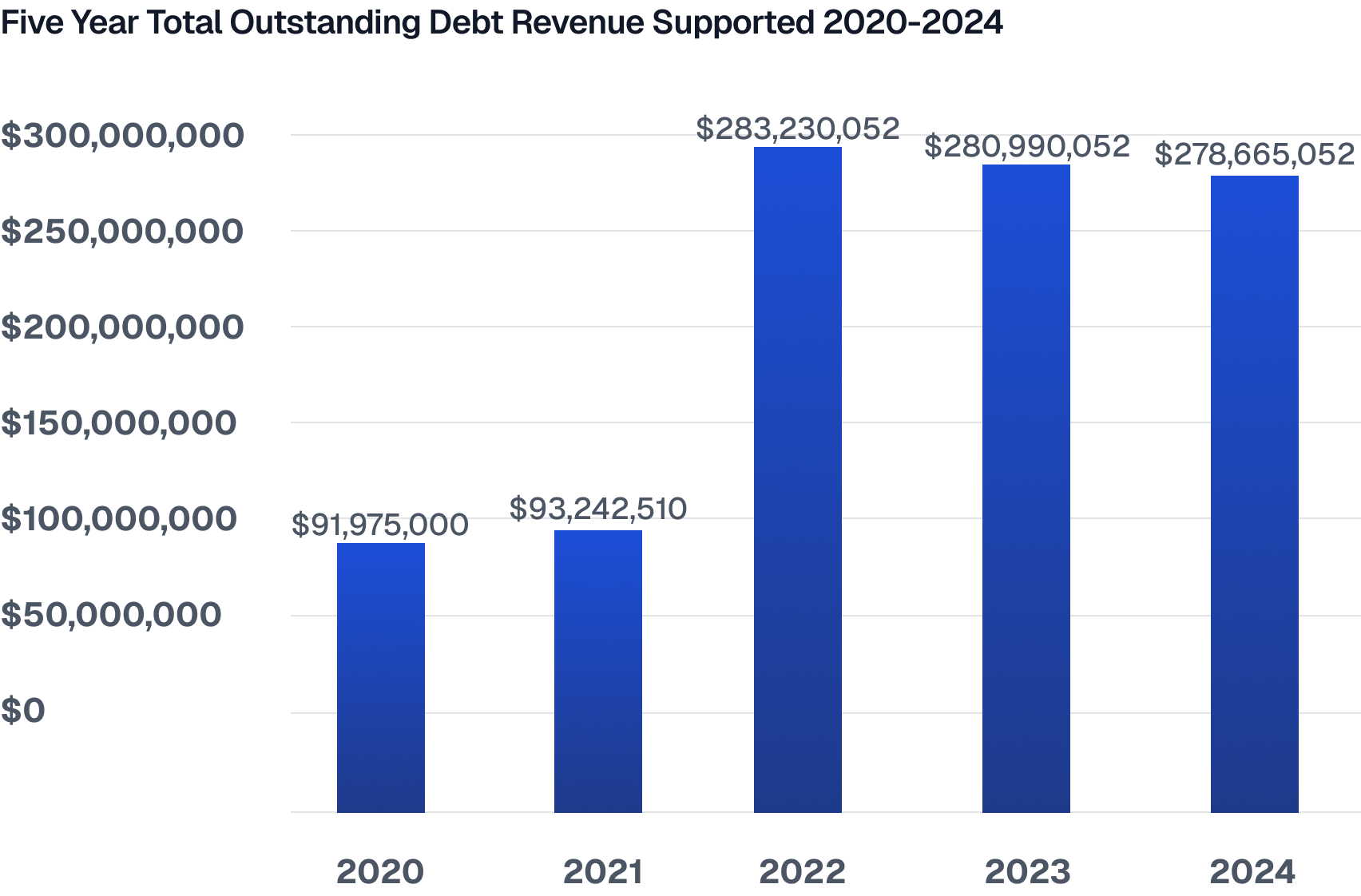 The Authority is committed to providing reliable, timely and transparent information about its outstanding debt to the citizens of the county. Presently, the Authority has four outstanding revenue bonds: bond series 2020, was issued September 1, 2020. The bond series 2020 consisted of two bonds: a tax-exempt series 2020A and a taxable series 2020B. The taxable series was a partial advance refunding of the series 2013 bond, which resulted in $6,540,415 in present value savings. The remining principal balance of $1,425,000 related to the 2013 bonds was paid off at the end of 2023. On January 20, 2022, the Authority issued two additional bonds series 2022A and series 2022B. The purpose of the 2022A series was to begin construction of phase 1 and phase 2 of the 365 Toll Road. The 2022B series was to fully repay the Junior Lien Bond Series 2016A and provide additional funding for the 365 Toll Road.